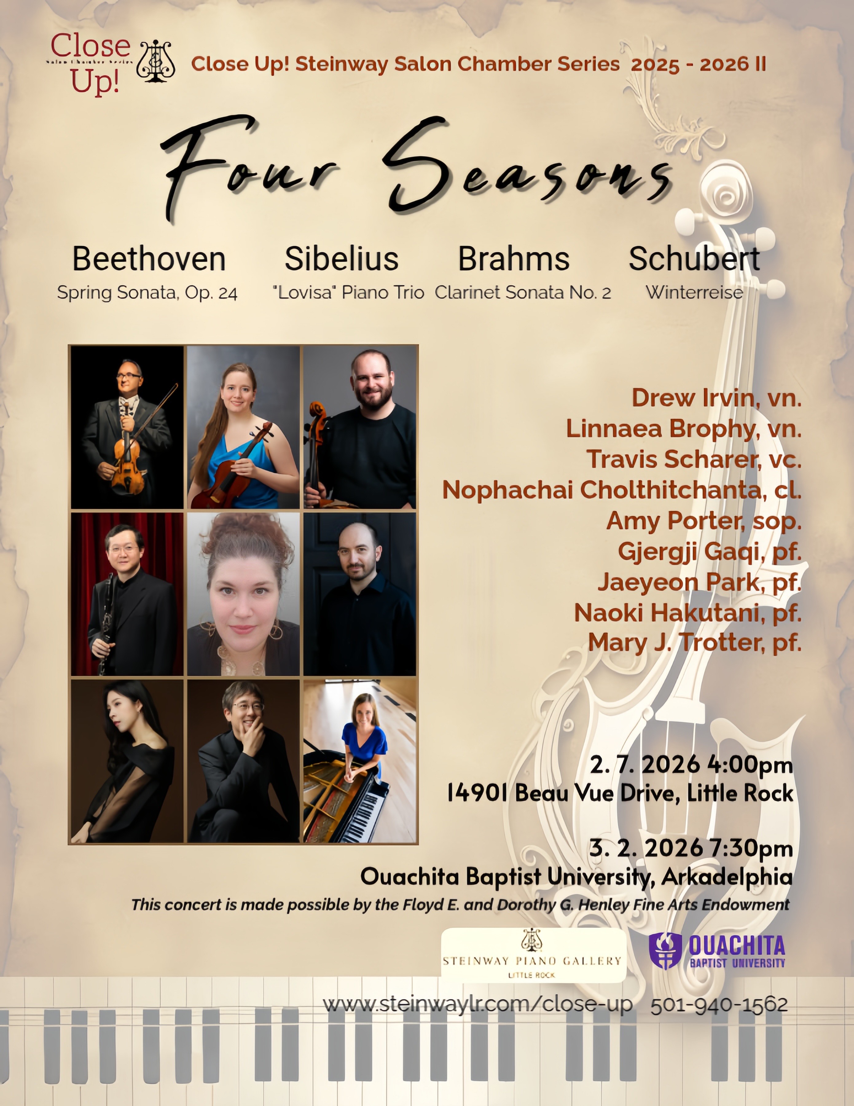This season, we are excited to expand the circle. We will present six concerts across three programs—Elegy, Four Seasons and The Last Testimony. For the first time, Close Up! will travel beyond Central Arkansas to Fayetteville and Arkadelphia.