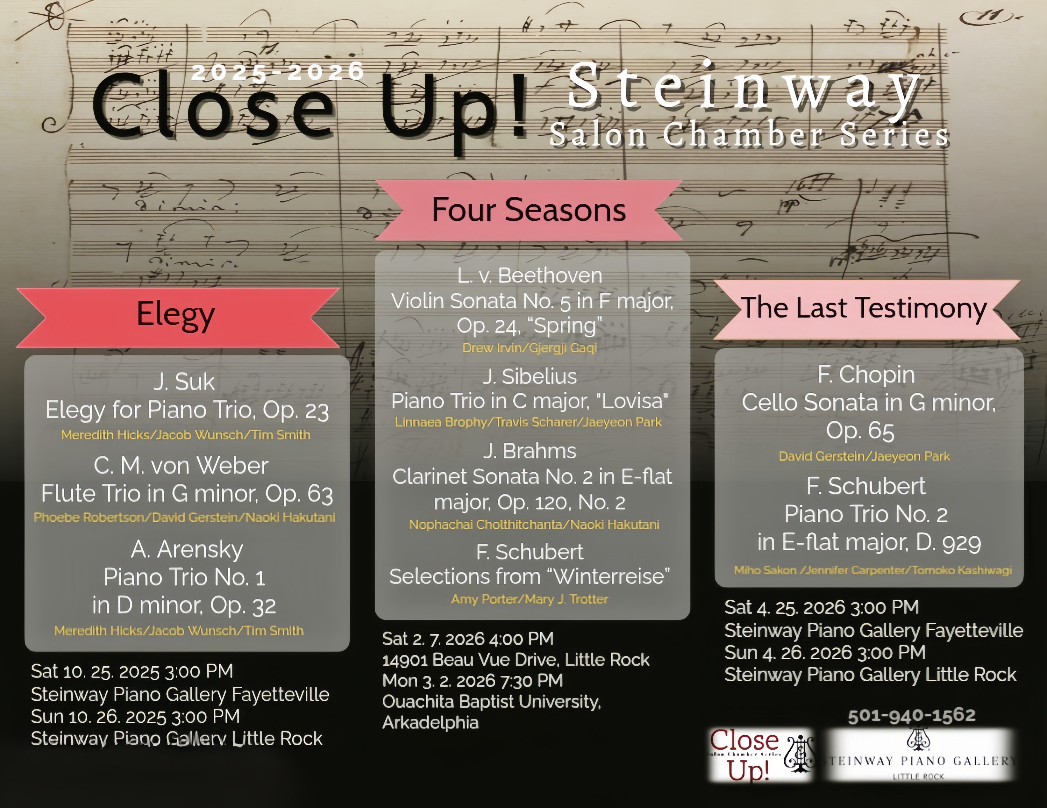 This season, we are excited to expand the circle. We will present six concerts across three programs—Elegy, Four Seasons and The Last Testimony. For the first time, Close Up! will travel beyond Central Arkansas to Fayetteville and Arkadelphia.